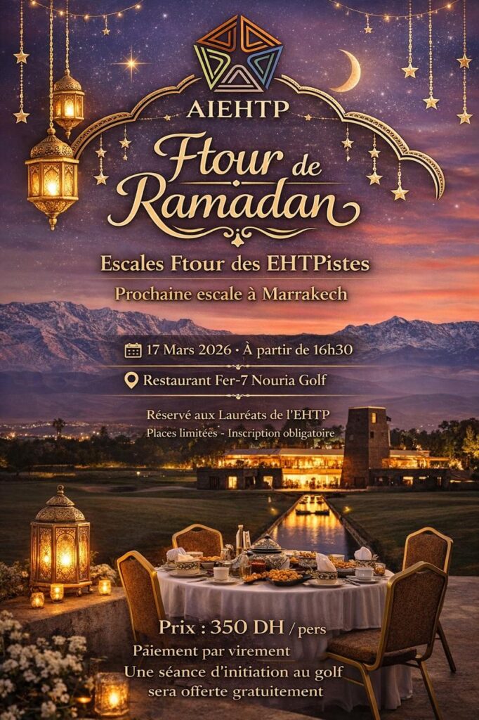 Dans l’esprit de partage et de convivialité qui caractérise le mois sacré de Ramadan, le Bureau National de l’AIEHTP a le plaisir d’annoncer le lancement des « Escales Ftour des EHTPistes », une série de rencontres autour du Ftour réunissant les ingénieurs lauréats dans plusieurs villes du Royaume.